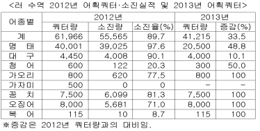 이번에 합의된 2013년 어획쿼터는 총 4만1천2백15톤으로 지난해의 6만1천9백66톤에 비해 33%나 감소했다.
