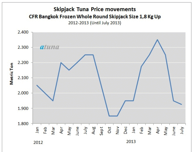 가다랑어 가격은 전반기 2,350달러로 최고치를 기록하였지만 최근 꾸준히 하향추세이다. 이는 이번 달 태국 바이어들이 가격을 1,930달러로 낮추려고 노력했던 것과 관계가 있다.