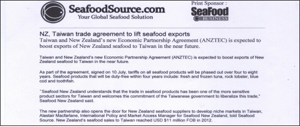 대만과 뉴질랜드의 새로운 체결된 경제동반자협정(ANZTEC)이 가까운 장래에 대만에 뉴질랜드산 수산물 수출을 증대시킬 것으로 기대된다며 수산전문지 「SeafoodSource」가 최근 보도했다.