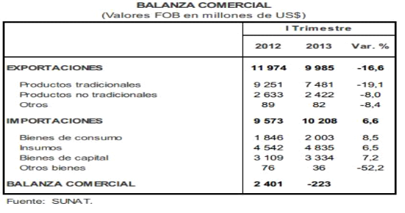 ㅇ 2013년 1/4 분기 페루 무역수지는 223만불 적자를 기록했는데, 이는 지난해 같은 기간에 비해 수출액이 16.6% 감소함에 기인함.