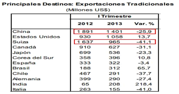ㅇ 전통적 페루 수출 대상국인 중국과 스위스 양국이 금년 1/4분기 동안 지난해 같은 기간에 비해, 광물소비를 줄임으로써 전통 수출액이 감소함.