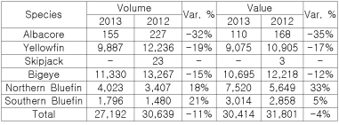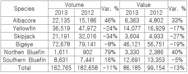 냉동 황다랑어(Yellowfin․Thunnus albacares)와 가다랑어(Skipjack․Katsuwonus pelamis)의 수입량은 상당폭 감소한 반면, 참다랑어(Bluefin tuna․Thunnus Thynnus) 수입량은 대폭 증가한 것으로 집계됐다.