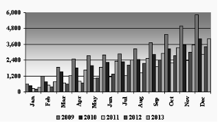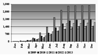 <09~13년 월별 냉장 북방 참다랑어 수입량 누계 대비(톤)>