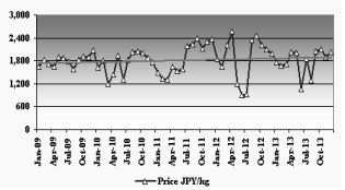 지난해 12월 평균 수입가격은 kg당 2천27엔으로 전년 12월과 비슷한 수준이었다.