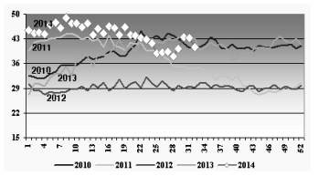 kg당 30NOK를 밑돌았던 노르웨이의 연어 시세는 2012년 연말경부터 지속적인 오름세를 타기 시작해 지난해 중반에는 kg당 45NOK를 뛰어 넘었다.(그림 참조)