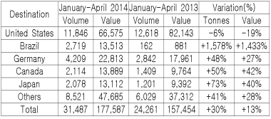 특히 브라질로는 15배나 많은 물량이 수출돼 새로운 수출시장으로 급부상했다.