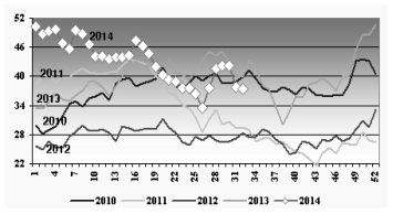 냉동제품의 32주차 시세는 kg당 40.64NOK(4.85유로)로 지난해 같은 기간에 비해서는 6% 하락했지만, 2012년 동기에 비해서는 39% 높은 수준이었다.