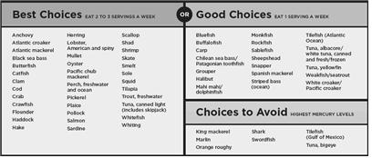 일반적으로 많이 먹는 생선 가운데 수은 수치가 낮은 생선으로는 새우․연어․참치통조림․틸라피아(역돔)․메기․대구·굴·고등어·명태 등을, 피해야 될 생선으로는 멕시코만에서 잡힌 옥돔과 상어․황새치․청새치․오렌지러피․눈다랑어․동갈삼치 등을 꼽았다.