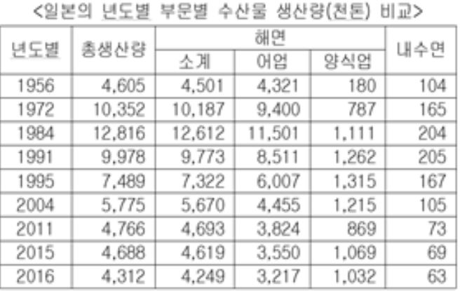 1972년 수산물 생산 1천만톤 시대를 연 일본은 20년만인 1991년부터 9백만톤 대로 떨어진 이후 계속 생산이 감소돼 왔다.