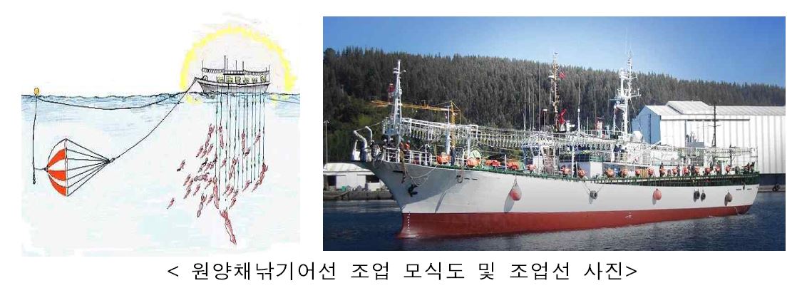* 원양채낚기어업 : 집어등으로 오징어 어군을 선박 밑에 모이도록 하고, 자동조상기(낚기어구)를 사용하여 어획하는 방식의 어업