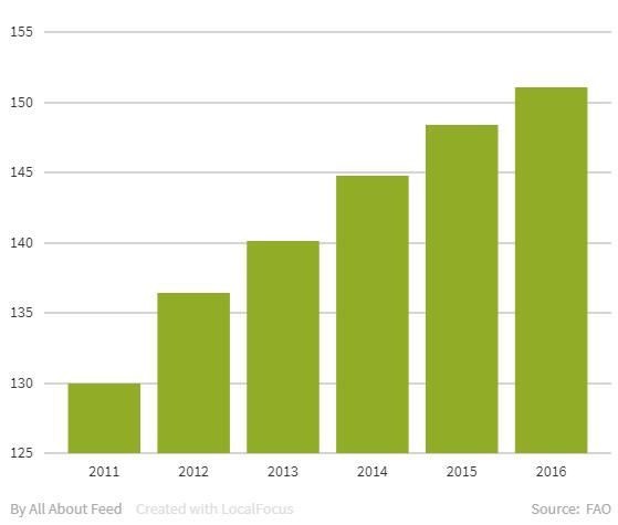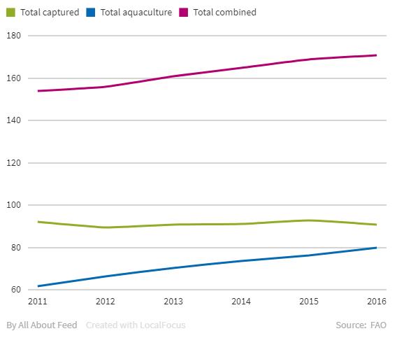 2016년 세계 어류 생산량은 171백만톤으로 최고치를 기록했으며 양식 생산량은 총 생산량의 47%(비식품용(어분, 어유 감소 포함) 제외시 53%)이다.