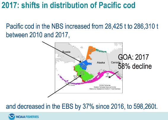 NOAA 대변인인 Mooney-Seus는 2018년 알래스카 만에서 저층 트롤 조사는 실시되지 않았지만 2017년 조사에서는 대구 생물량이 107,324톤으로 감소했다고 말했다. 2015년 조사결과와 비교하여 58% 감소하였고 2013년 조사결과와 비교하여 78% 감소하였다.