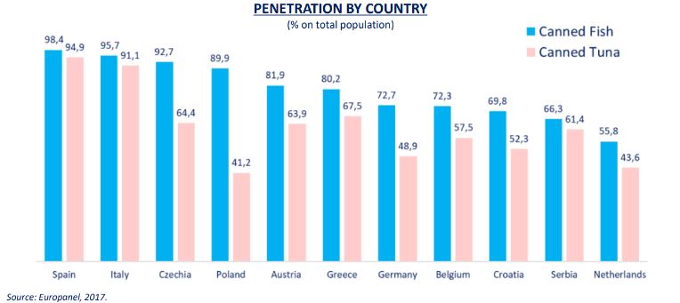 참치에 대한 열정은 지중해 지역, 특히 거의 모든 시민이 연간 1회 이상 참치 통조림을 섭취하는 스페인과 이탈리아에서 매우 높다. 실제로 이 나라들에서는 생선 통조림을 먹는다는 것은 참치를 먹는 것과 동의어이다.