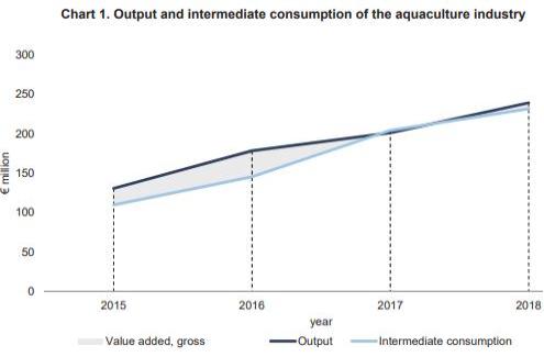 양식업을 운영하는 기업들에 대한 연간 조사에 따르면 양식업 총 생산량은 2017년에 비해 38백만 유로 증가한 239.2백만 유로에 달한다. 반면에 비용은 27.3백만 유로 증가하였다. 그 결과 산업의 총 부가가치는 760만 유로에 달하였다.