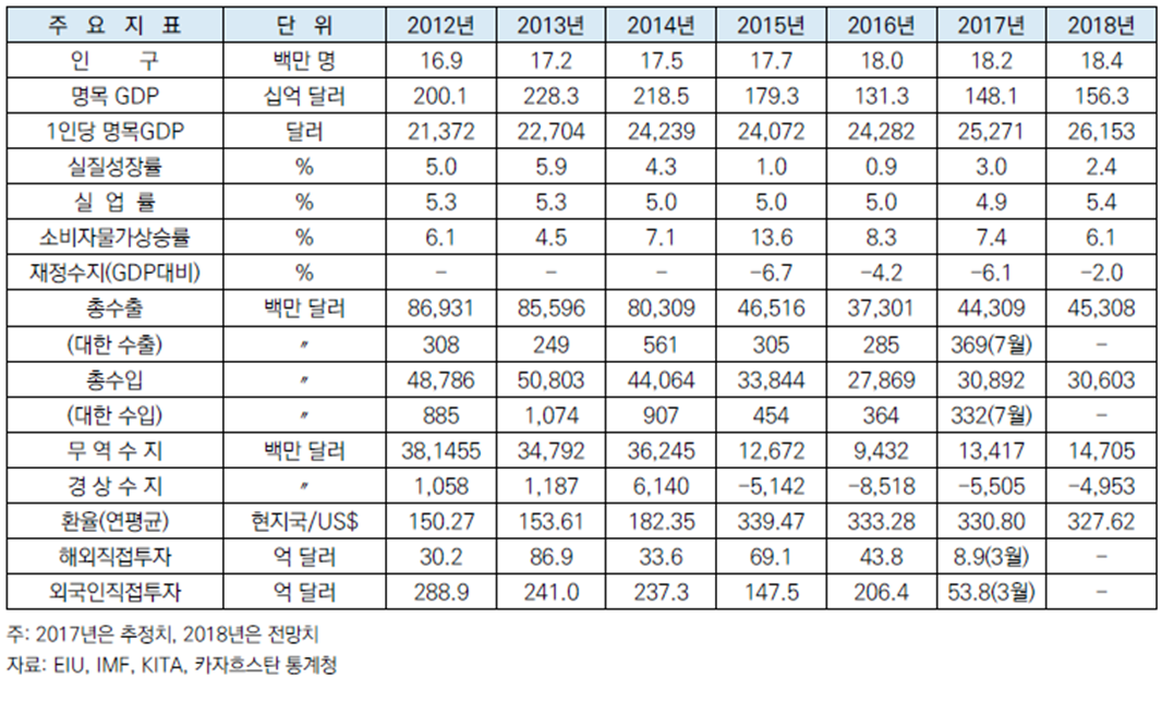 카자흐스탄 중앙은행은 카자흐스탄이 그 동안의 부정적인 외부요인을 이겨내고 2017년 13%, 2018년 4%의 경제성장을 달성할 것으로 전망했다. 2015/2016년은 저유가의 장기화와 러시아의 경기침체, 그리고 갑작스런 환율별동으로 1% 남진 성장하는데 그쳤다. 하지만 2017년 기준 카자흐스탄의 주요 분야인 산은 7.7%, 농업 2.7%, 건설 0.7%, 운송 4.4%, 통신 2.7%의 성장을 보였다. 아래 표 1은 카자흐스탄의 주요 경제지표를 보여주고 있다.