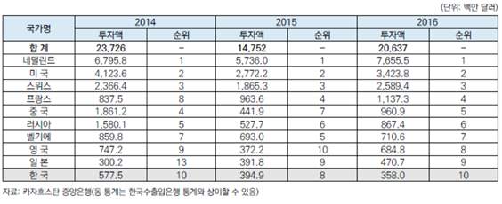 카자흐스탄의 주요 투자국은 네덜란드, 스위스, 프랑스, 중국 등이다. 우리나라는 아래 표 2에서 보는 바와 같이 10위권을 유지하고 있다. 하지만 다른 주요 투자국 9개의 투자액은 대부분 지속적으로 증가하고 있으나 우리나라는 2014년 577.5백만 달러에서 2016년 358.0백만 달러로 지속적으로 감소하고 있다. 아래 표 3에서와 같이 국내 산업의 카자흐스탄 수출입 동향을 보면 지속적으로 감소하고 있는 것을 알 수 있다. 이와 같은 현황은 아래 표4에서 보여주는 봐와 같이 최근 5년간의 투자 신고 건수와 투자액 변화를 보여주고 있다.