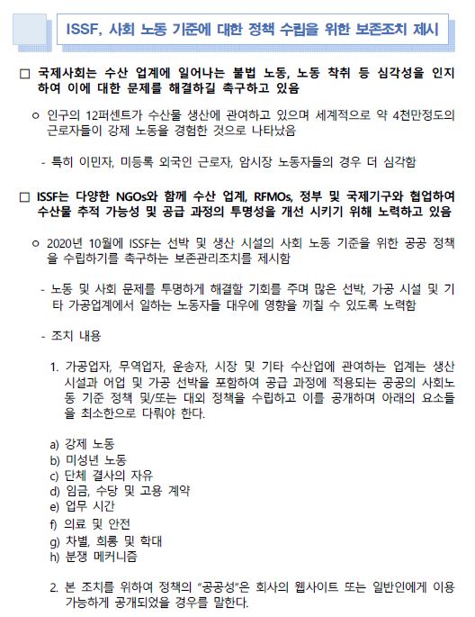 ISSF, 사회노동 기준에 대한 정책 수립을 위한 보존조치 제시