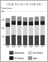 엔화의 강세와 가공새우에 대한 높은 수요로 인해 일본의 지난해 새우 수입량은 28만5천3백톤에 달해 2010년보다 1.6% 증가한 반면, 중국의 새우 수입량은 5만3천톤에 그쳐 7.8% 감소했다.