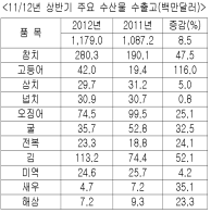 오징어는 어획량 증가에 따른 수출가격이 떨어진 데다 주요 수출 대상국인 중국의 생산 증가로 인해 전체 수출고가 감소했다.