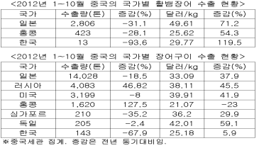 한편, 장어구이 제품의 1~10월 수출실적은 2만6천8백58톤(8억8천5백63만8천1백달러)으로 2011년 동기에 비해 물량은 4.6% 감소했지만, 금액은 27.1% 증가했다.