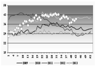 43주차에 형성된 평균 수출가격은 kg당 39.97NOK(4.91유로)로 1달 전에 비해서는 비슷했지만, 지난해 같은 기간에 비해서는 35%, 2011년 같은 기간에 비해서는 44%나 오른 수준이었다.
