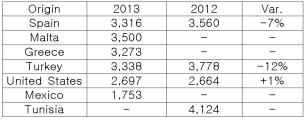 수입량이 가장 많은 멕시코산의 수입가격은 kg당 1천7백53엔으로 전체 평균을 밑돌았지만, 스페인과 몰타․그리스․터키산 참다랑어 가격은 모두 3천엔 이상을 형성해 전체 평균보다 크게 높았다.