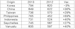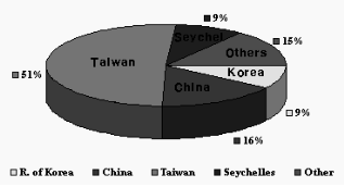 한국과 세이셸은 각각 9%(6천5백톤)씩을 차지해 3위 수입시장이었다.