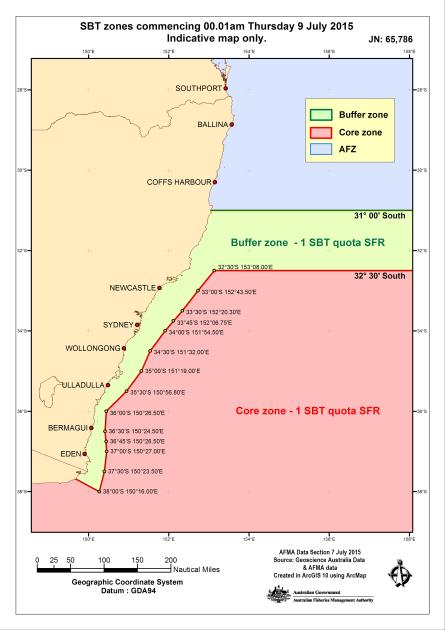 ㅇ AFMA는 동부 연안의 남방참다랑어 회유 경로를 관리수역으로 설정하며, 일주일 마다 이를 검토함. 핵심(core) 및 완충(buffer)지대로 구분된 동 수역은 매주 수요일 VMS를 통해 선박에 통지됨
