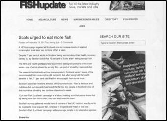 Seafish에 의해 실시된 조사는 스코틀랜드 성인들 중 74%가 건강에 대한 우려가 있음에도 불구하고 스코틀랜드인들 중 70%는 어류를 충분히 섭취하고 있지 않다는 사실을 밝혀냈다.이 보도에 따르면 스코틀랜드인들을 대상으로 한 「Seafish」의 새로운 캠페인(구호 : “1주일에 생선 2끼”)은 1주일에 해산물 소비 수준을 적어도 2끼까지 해산물(어류) 섭취를 늘리도록 하는데 목적이 있다.