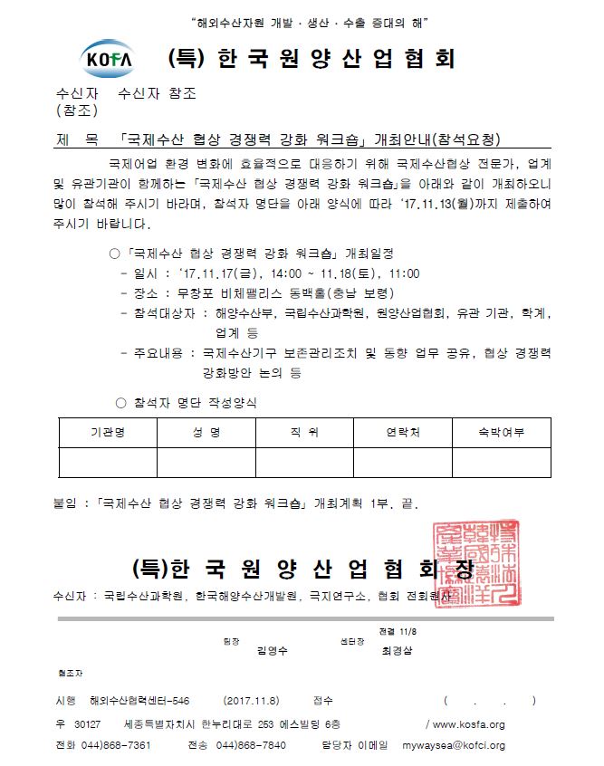 「국제수산 협상 경쟁력 강화 워크숍」 개최안내(참석요청)