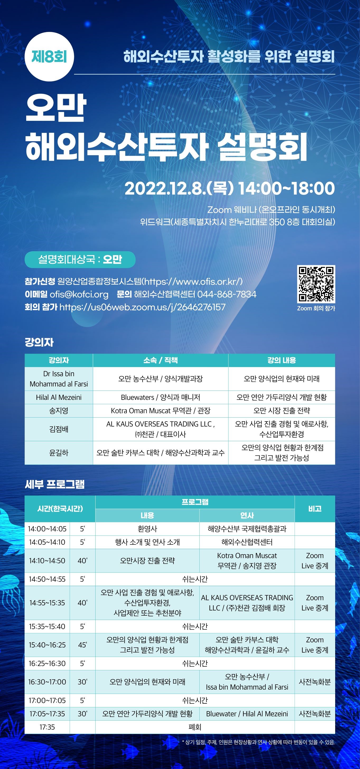 3. 현장 참석이 곤란하신 분들은 아래 zoom 링크에 접속하여 참여하실 수 있으니, 해외수산투자(ODA포함)나 오만의 수산업 현황과 관련하여 관심있는 분들의 적극적인 참여를 부탁드립니다.