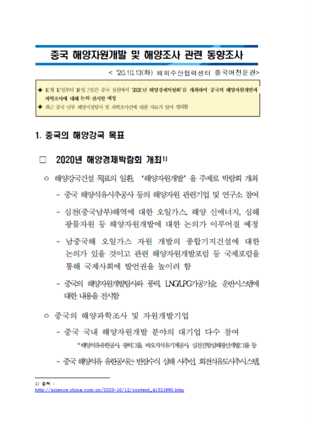 | 제목 | (해양영토) 중국 해양자원개발 및 해양조사 관련 최근 중국 동향 | |||