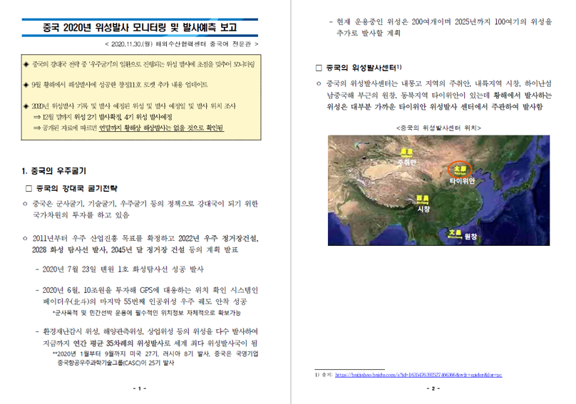 - (해양영토) 2020년 황해 해상위성발사 모니터링 및 기타 발사예측 보고